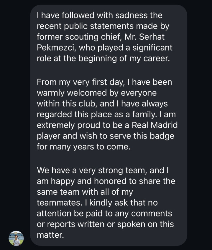 虎扑02月13日讯针对前技术总监塞尔哈特-佩克梅兹奇声称自己在皇马遭遇“精神骚扰”的说法,土耳其新星居莱尔本人首次做出正面回应,明确予以否认。